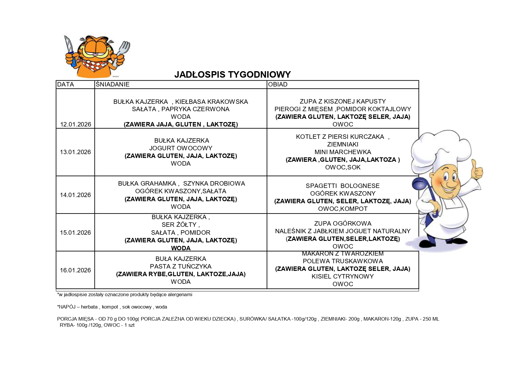 Jadłospis na tydzień 12.01 - 16.01