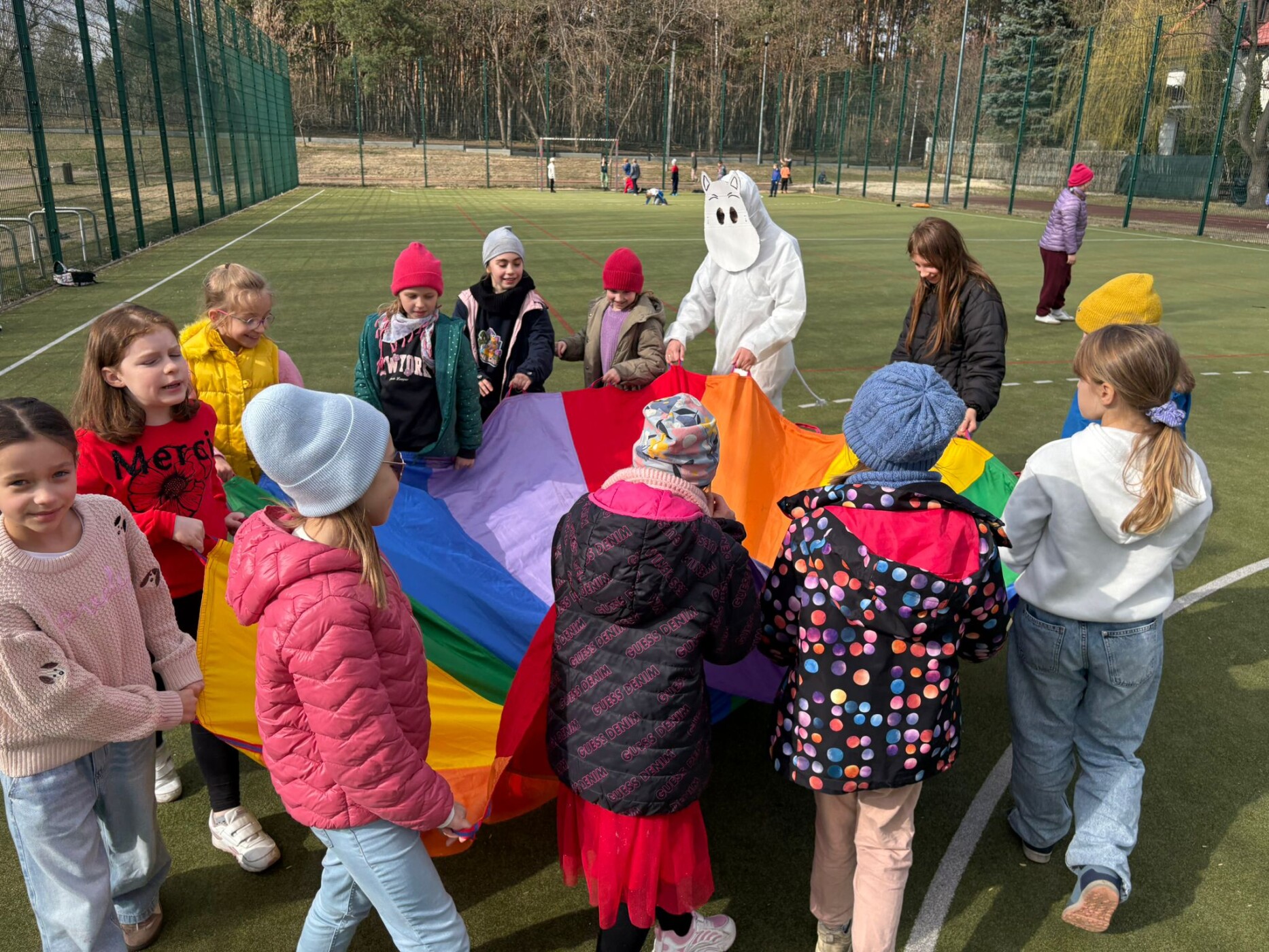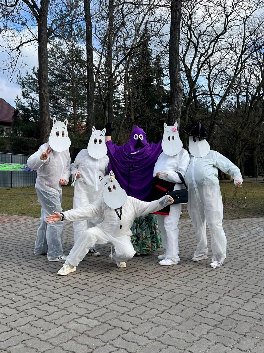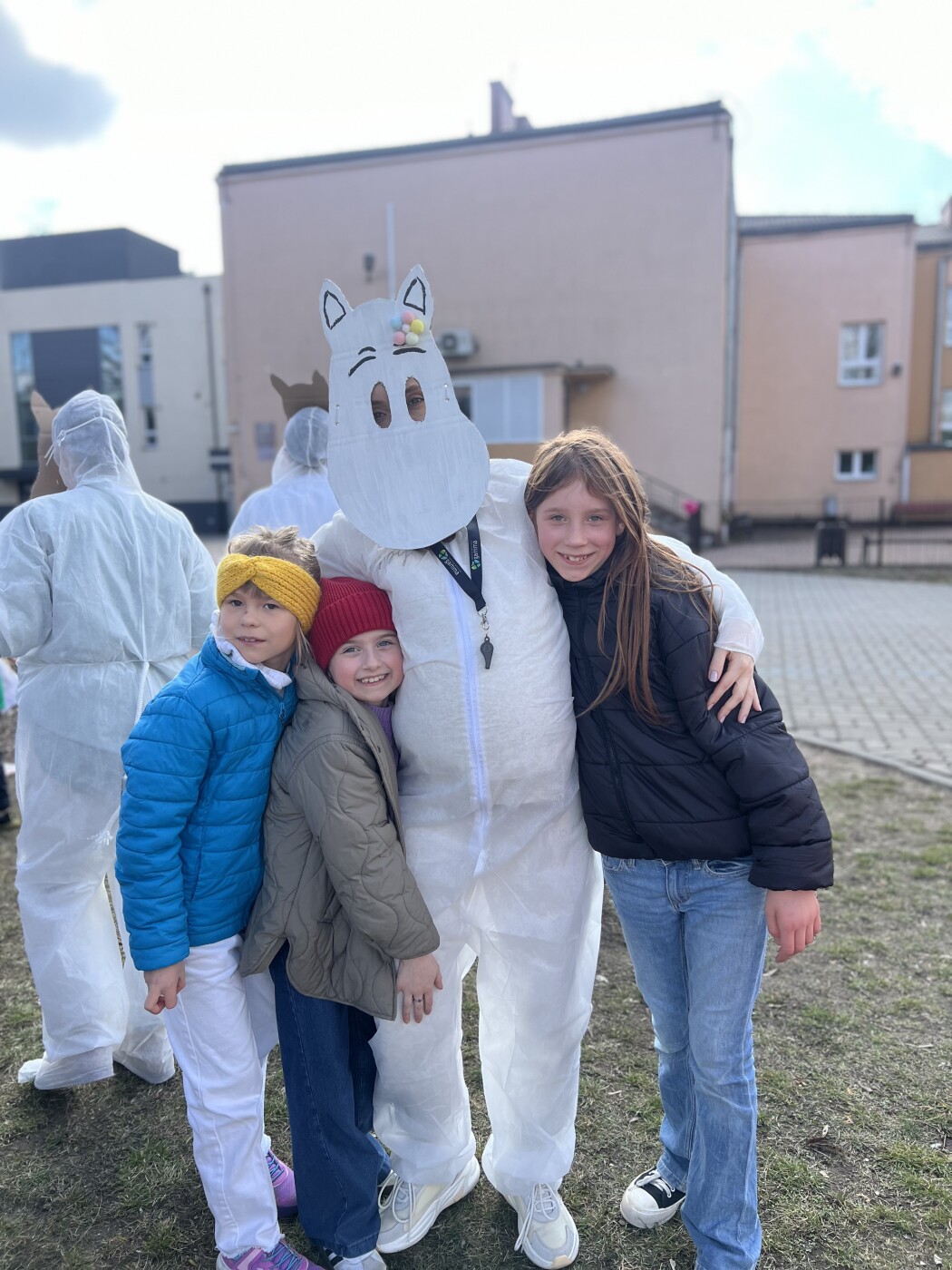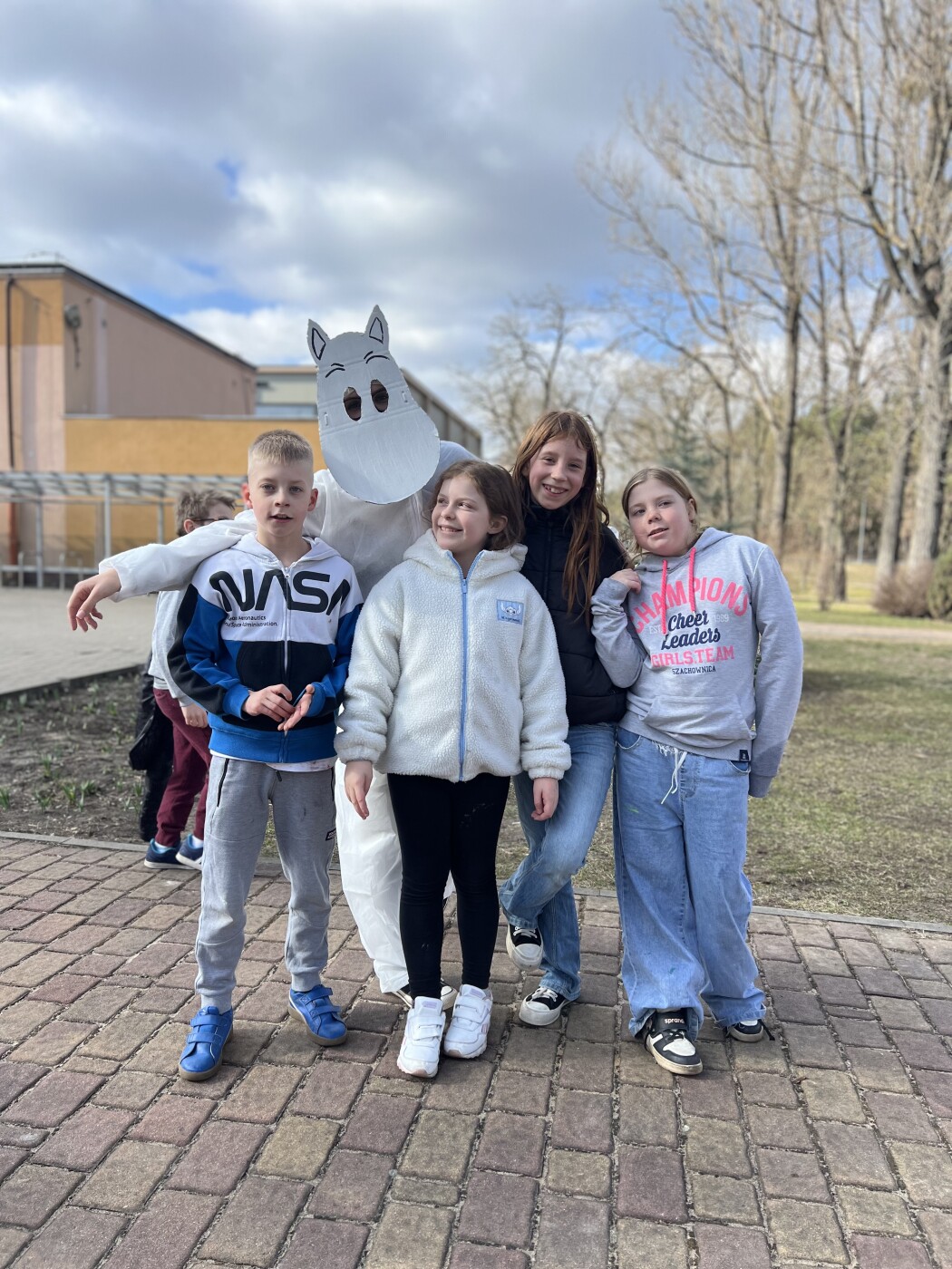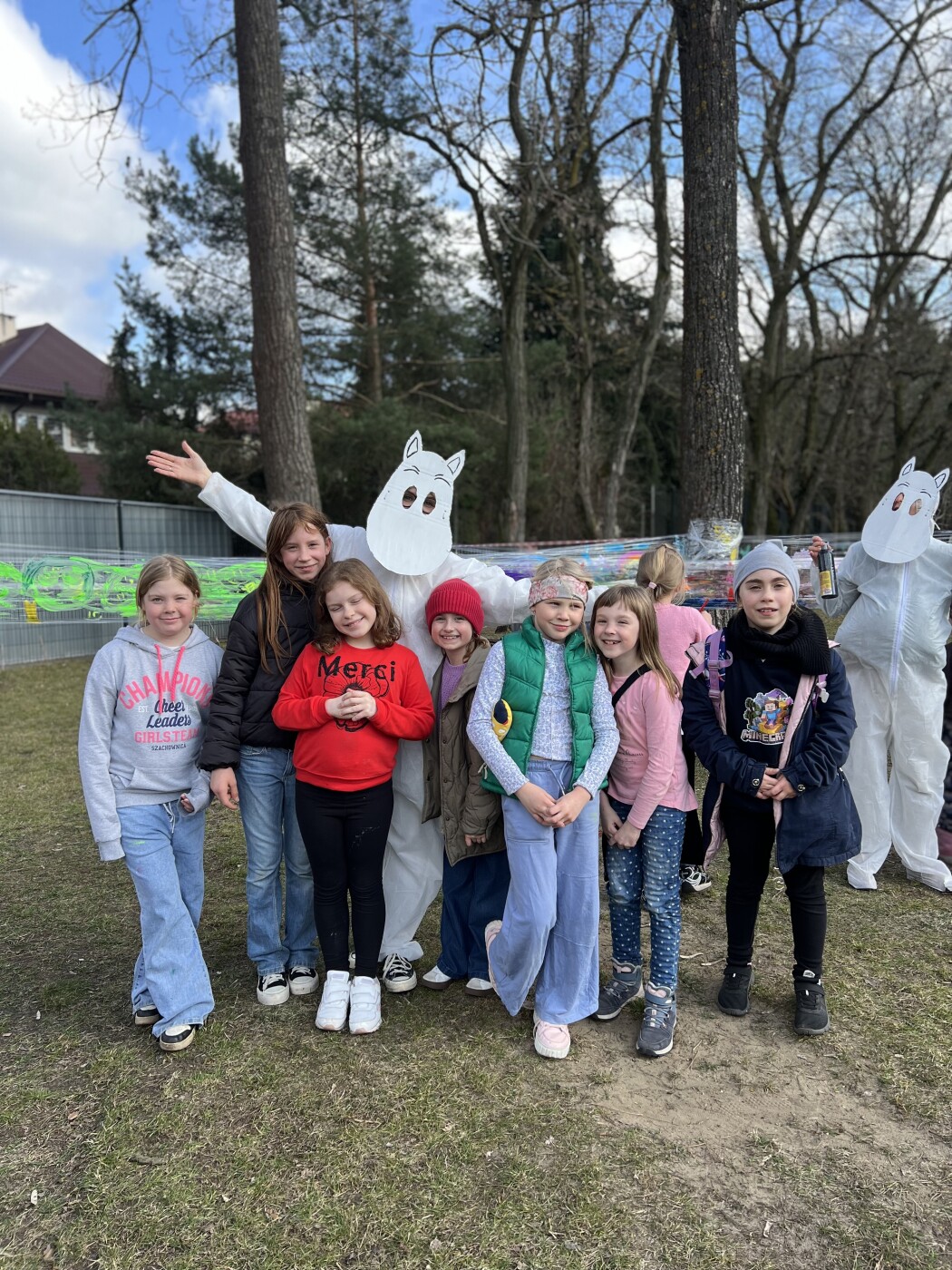 Postacie znane wszystkim z powieści Tove Jansson pojawiły się w szkole już od rana. Wspólnie czekaliśmy na pojawienie się wiosny. Najpierw w sali gimnastycznej, ale o 13.00, gdy zrobiło się cieplej i zaświeciło słońce, można już było rozpocząć zabawy na boisku szkolnym i ogłosić,