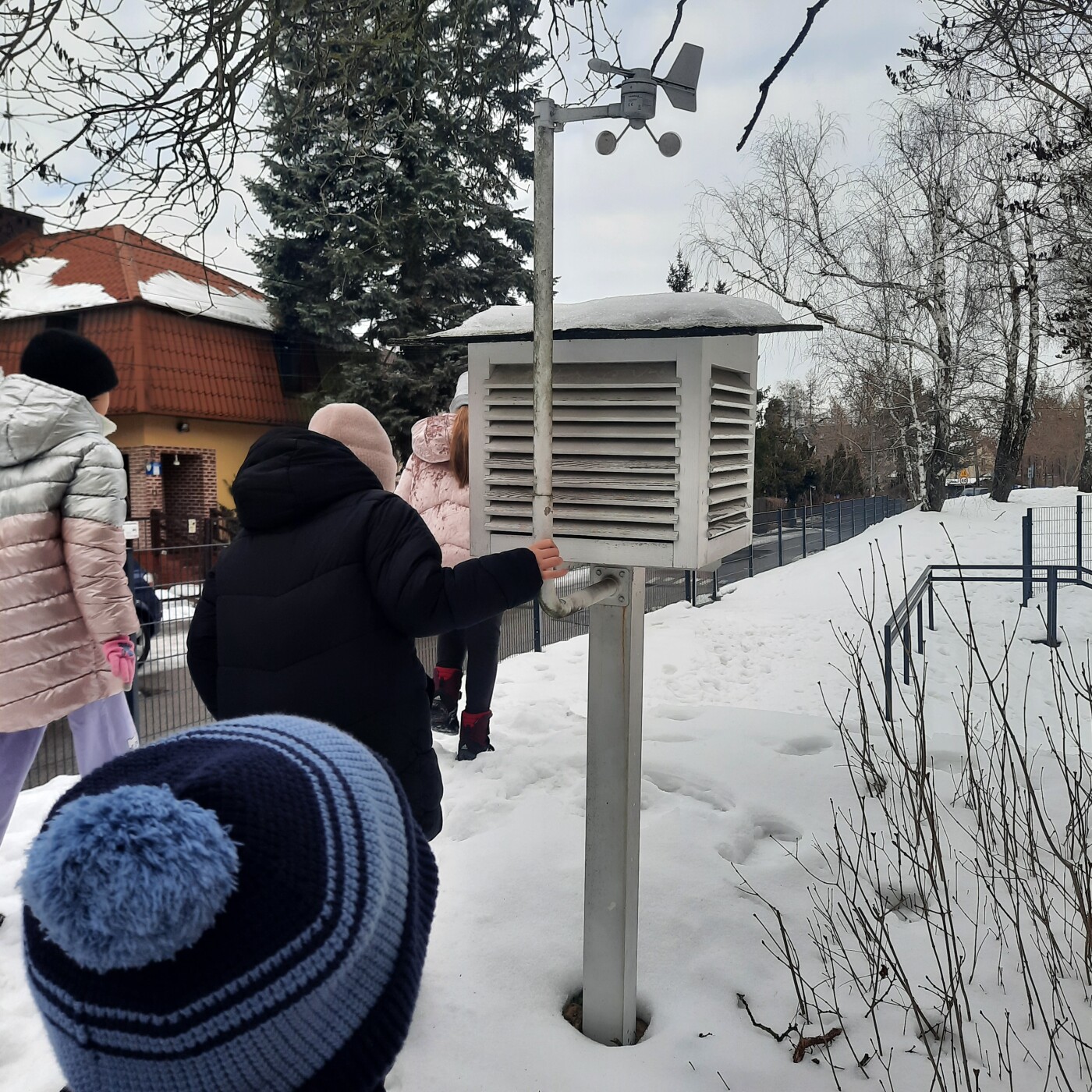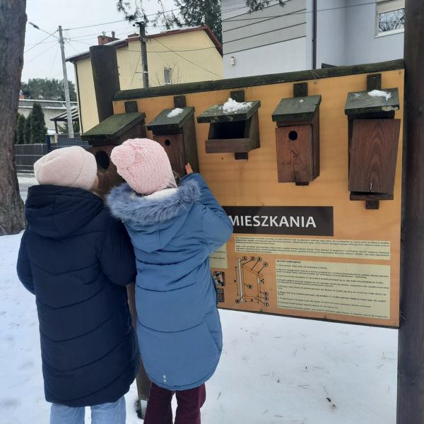 Wsypaliśmy do karmnika jedzenie dla ptaków. Oprócz tego z zainteresowaniem przeczytaliśmy znajdujące się tam inne przyrodnicze informacje oraz obejrzeliśmy budki lęgowe dla ptaków i wiatromierz.