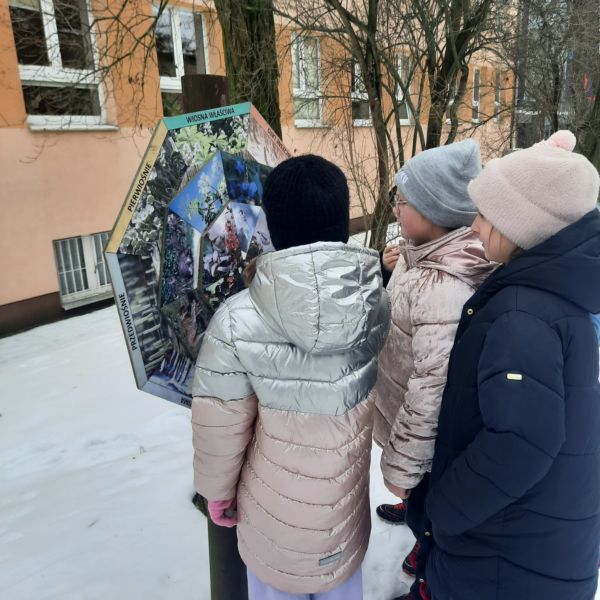 Dziś korzystając z ładnej, przedpołudniowej pogody wybraliśmy się z grupą świetlicowych dzieci na Przyrodniczą Ścieżkę Edukacyjną, w poszukiwaniu karmnika dla ptaków. Znajduje się ona na terenie szkoły przy ulicy Petunii.