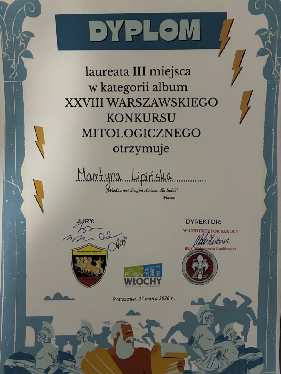 Z radością informujemy, że uczennica naszej szkoły Martyna Lipińska odniosła znaczący sukces w XVIII Warszawskim Konkursie Mitologicznym, który odbył się w marcu 2026 roku. Dziewczynka zdobyła zaszczytny tytuł laureatki III miejsca w kategorii album, potwierdzając swoją rozległą wiedzę oraz ogromne zaangażowanie w zgłębianie świata mitologii.