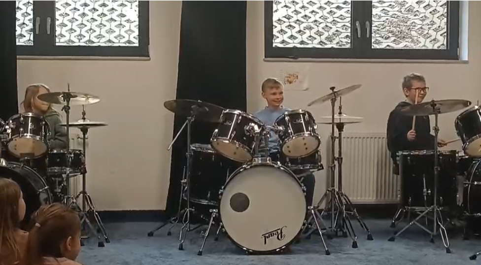 Podczas zajęć dzieci tworzyły własną piosenkę, wykazując się ogromną pomysłowością i zaangażowaniem. Miały również okazję spróbować gry na perkusji, co sprawiło im wiele radości i pozwoliło poczuć prawdziwą muzyczną energię.