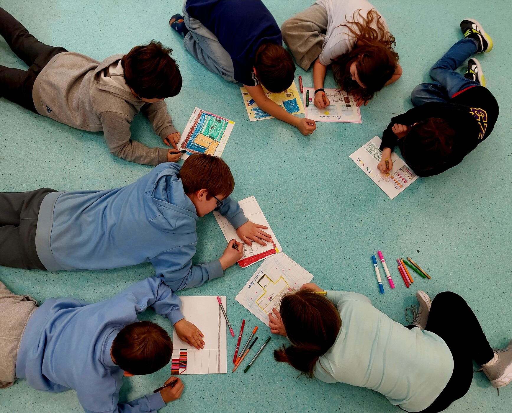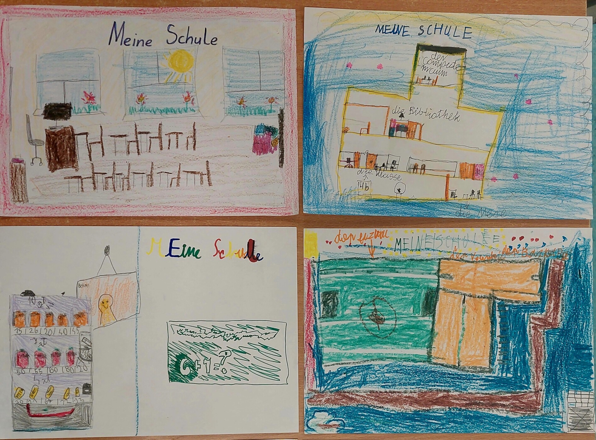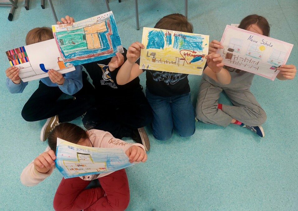 m.in. barwne rysunki z podpisami w języku niemieckim, które zostały przekazane uczniom z Niemiec.