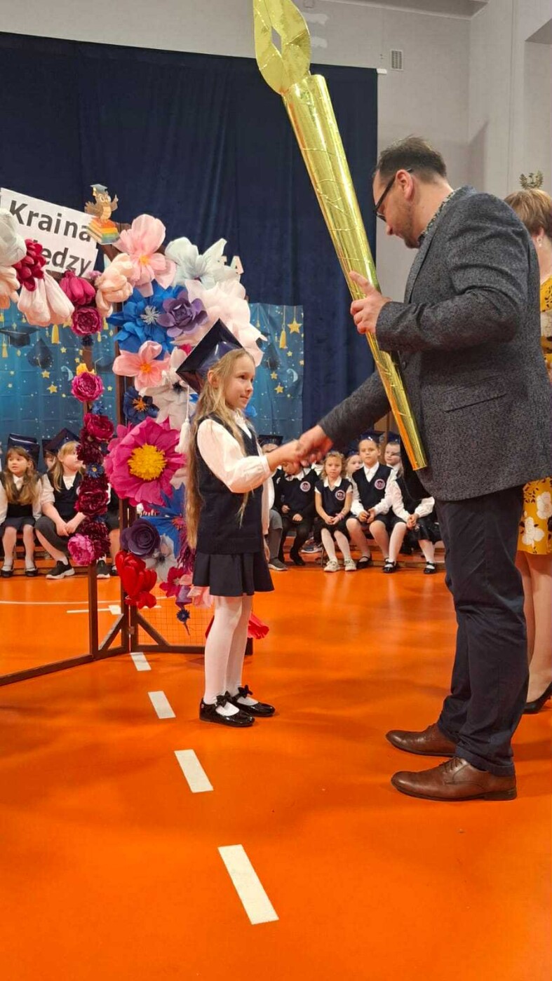 Uczniowie przygotowali piękną oprawę artystyczną uroczystości. Pan Dyrektor gratulował rodzicom wyboru szkoły i złożył uczniom życzenia, by podróż do krainy nauki i wiedzy, była dla nich fascynującą przygodą. Piękne życzenia dyrekcji i nauczycielom złożyli przedstawiciele rodziców. Życzliwość Patrona szkoły przeniknęła szkolne mury i uczyniła ten dzień wyjątkowym.