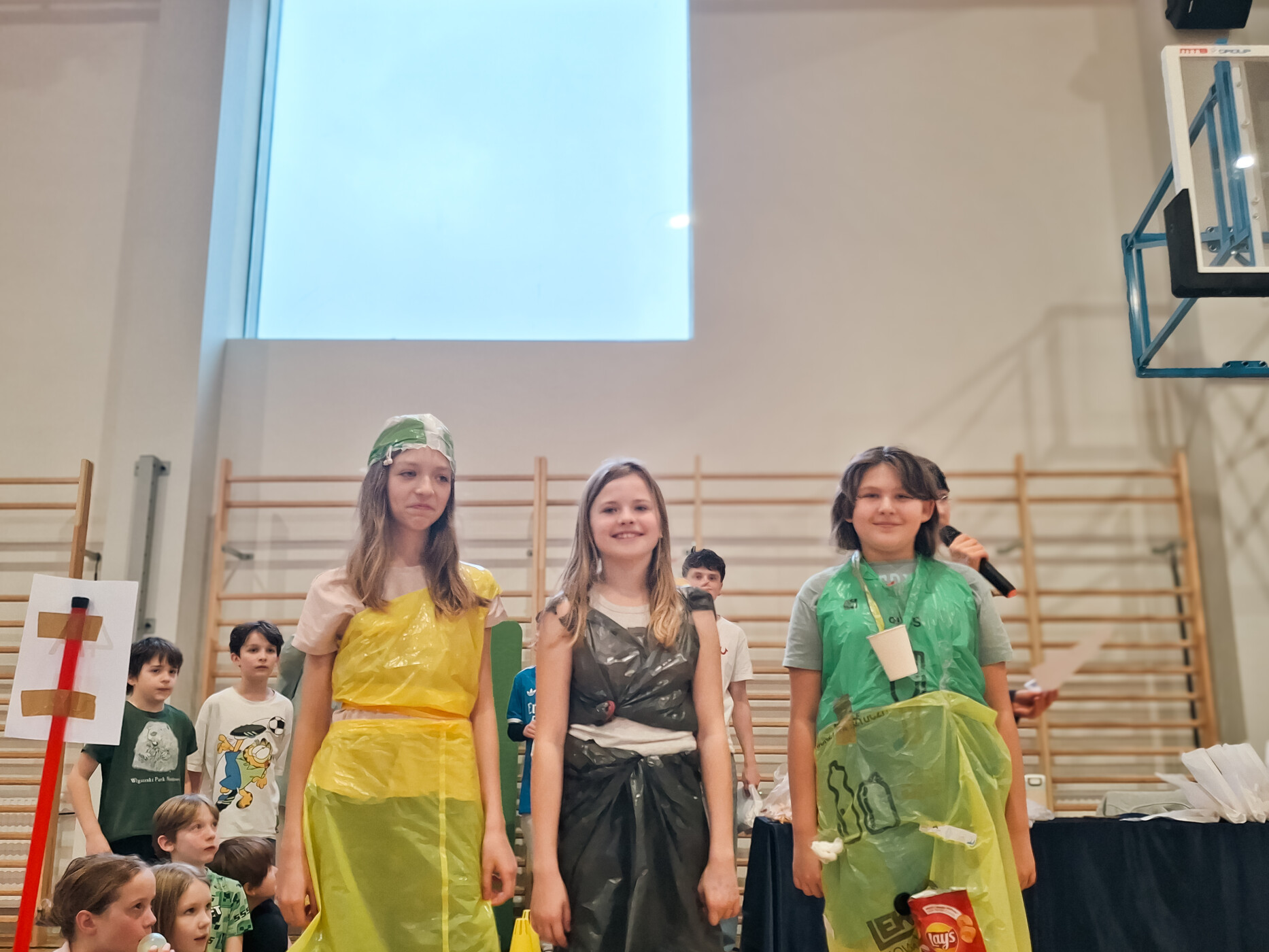 Głównym punktem programu był Konkurs Talentów, nad którym czuwał Pan Dawid Drapalski. Na scenie zobaczyliśmy niesamowite występy wokalne, taneczne i akrobatyczne. Tuż po nich odbył się Pokaz Mody Ekologicznej. Uczniowie zamienili surowce wtórne – gazety, worki, nakrętki i kartony – w kreacje godne największych wybiegów.