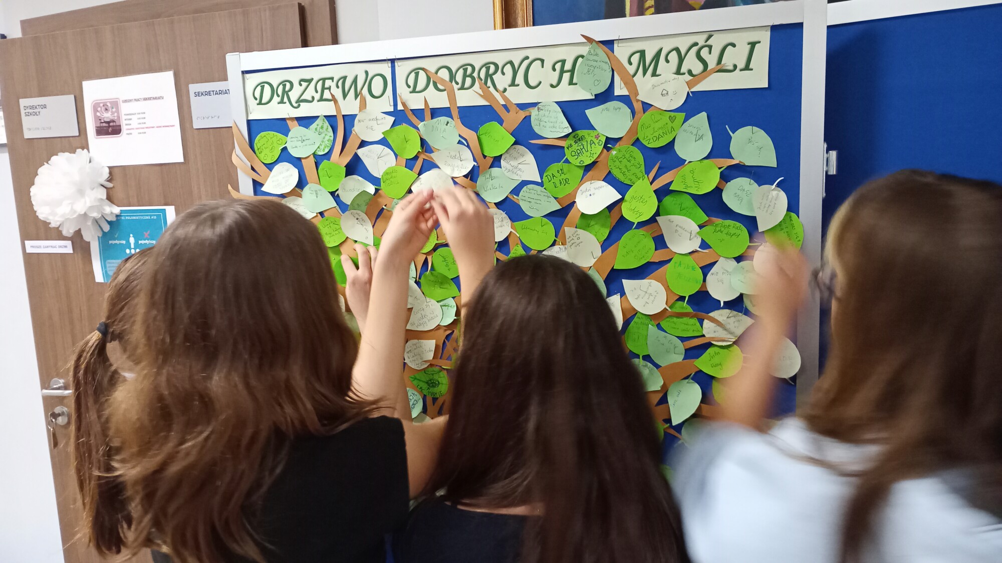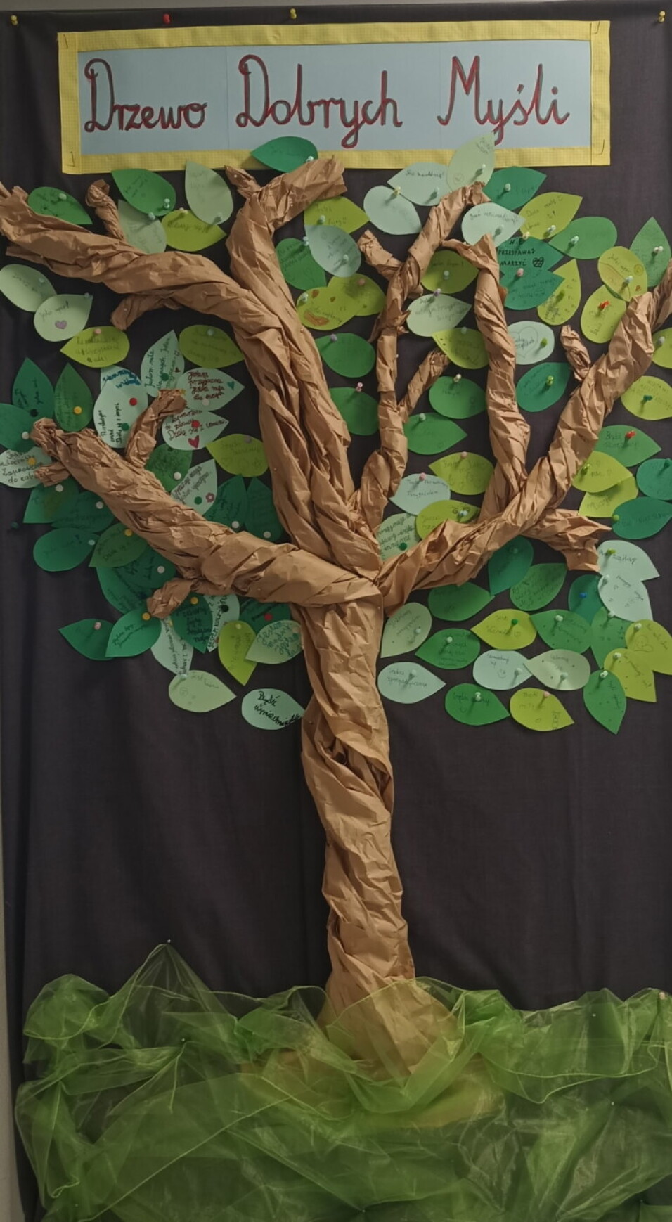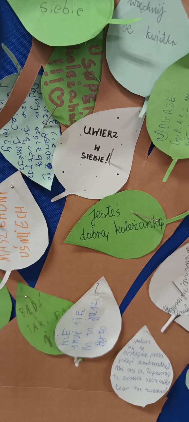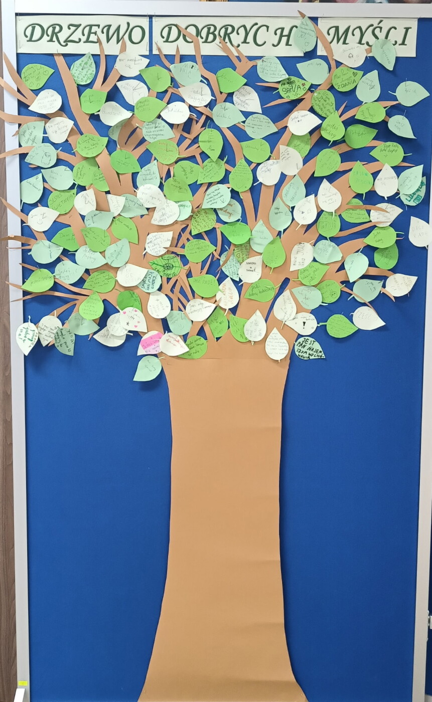 Dzieci z klas 1 -3 pracowały w grupach, integrując się ze sobą np. wykonując rzeźbę klasową. W klasach starszych, na godzinach wychowawczych, zastanawiali się co znaczy przynależność, jakie ma znaczenie i co robić by samemu znaleźć wspierających przyjaciół, a także jak pomóc innym czuć się dobrze w szkole i klasie. W parach lub pojedynczo wykonali również liście na „Drzewo Dobrych Myśli”. NA wyciętych liściach pisali coś motywującego, miłego, inspirującego co sprawi, że osoba czytająca to poczuje się lepiej lub zmotywowana do działania. Liście zostały powieszone na dwóch wiosennych „DRZEWACH DOBRYCH MYŚLI”.