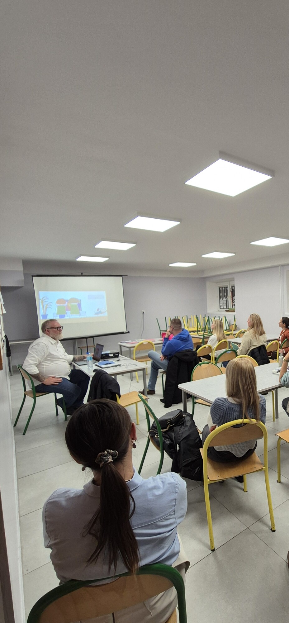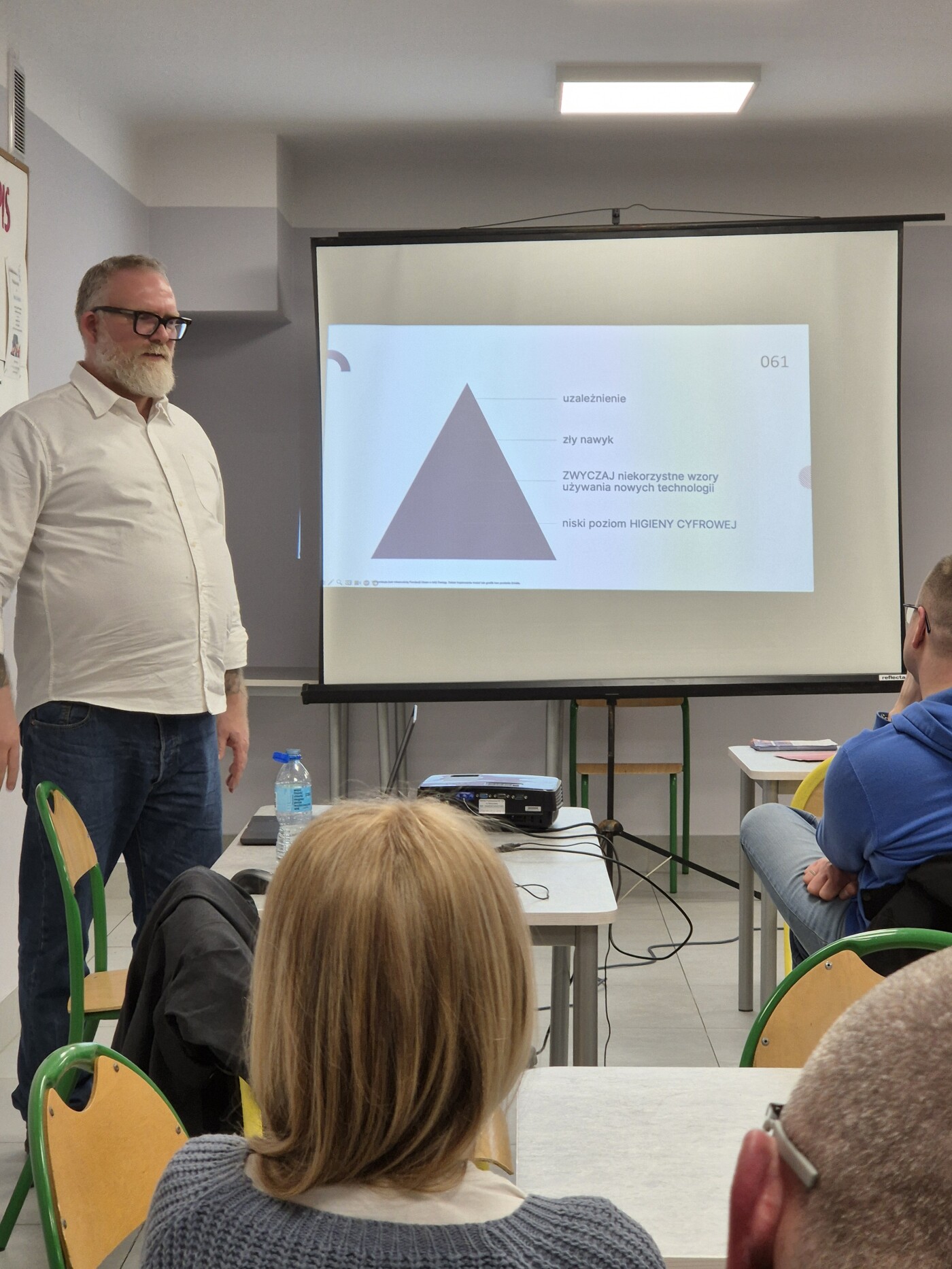 Szkolenie miało charakter praktyczny — uczestnicy otrzymali konkretne wskazówki, jak rozpoznawać symptomy fonoholizmu, jak rozmawiać z dziećmi o korzystaniu z telefonów oraz jak wprowadzać zasady higieny cyfrowej w codziennym życiu. Dużym atutem była jasna, komunikatywna forma przekazu, poczucie humoru prowadzącego oraz otwartość na pytania i dyskusję.