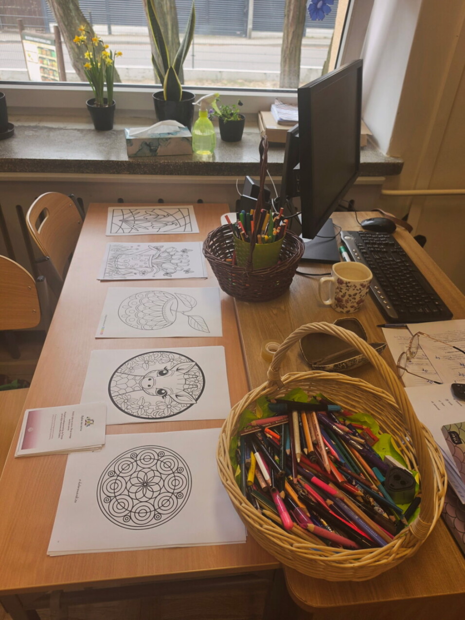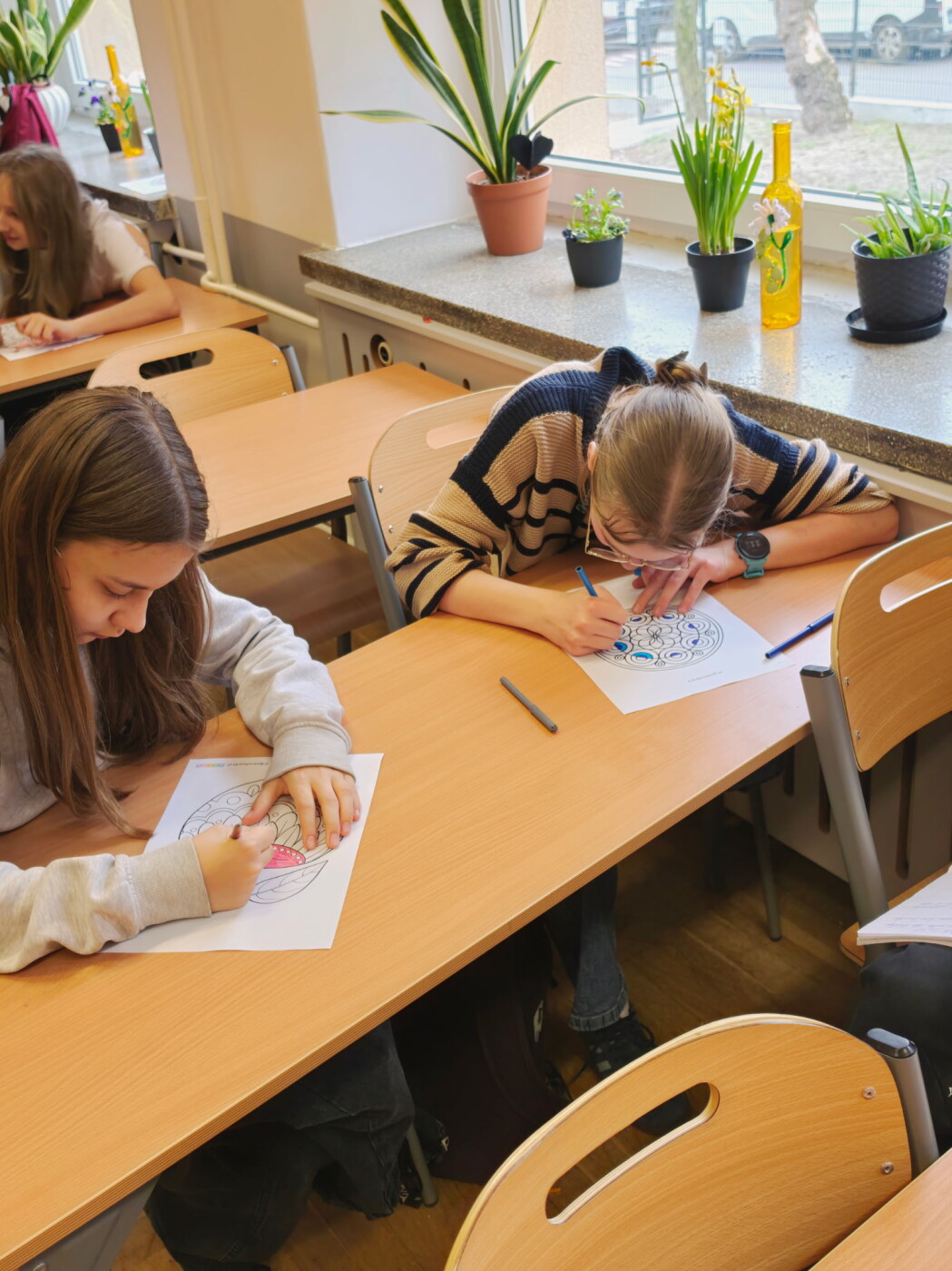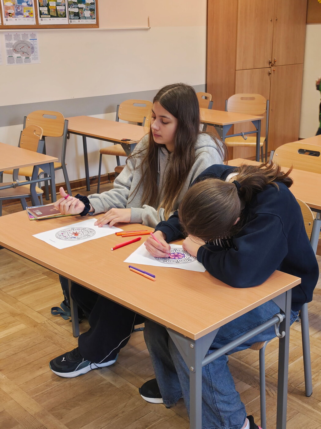 W ostatni dzień, w ramach III Tygodnia Zdrowia Psychicznego, w jednej ze szkolnych sal została zorganizowana strefa ciszy i relaksu. To miejsce, gdzie w czasie przerw można było spędzić czas przy relaksacyjnej muzyce, odpocząć, pokolorować mandale, pograć w gry i wykonać karty relaksacyjne, mające na celu uświadamianie odczuwanych emocji.