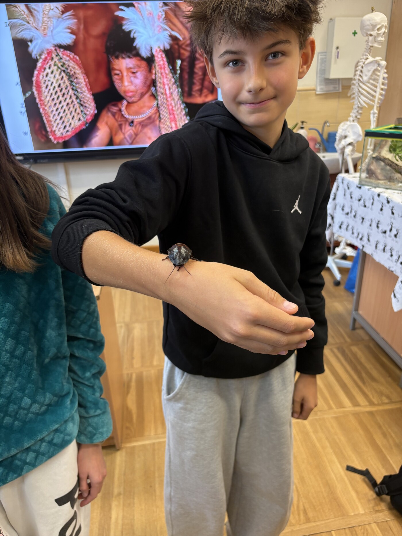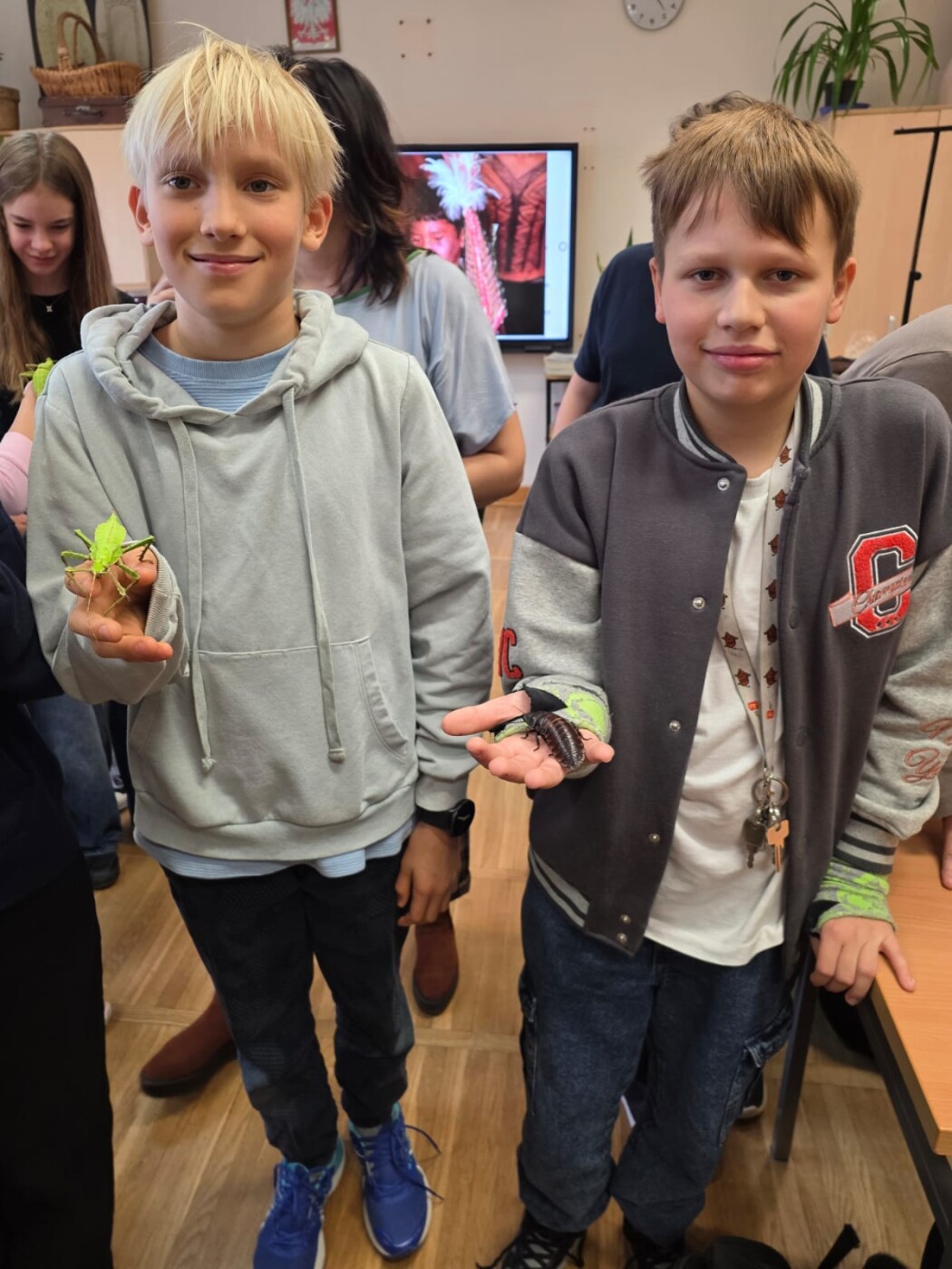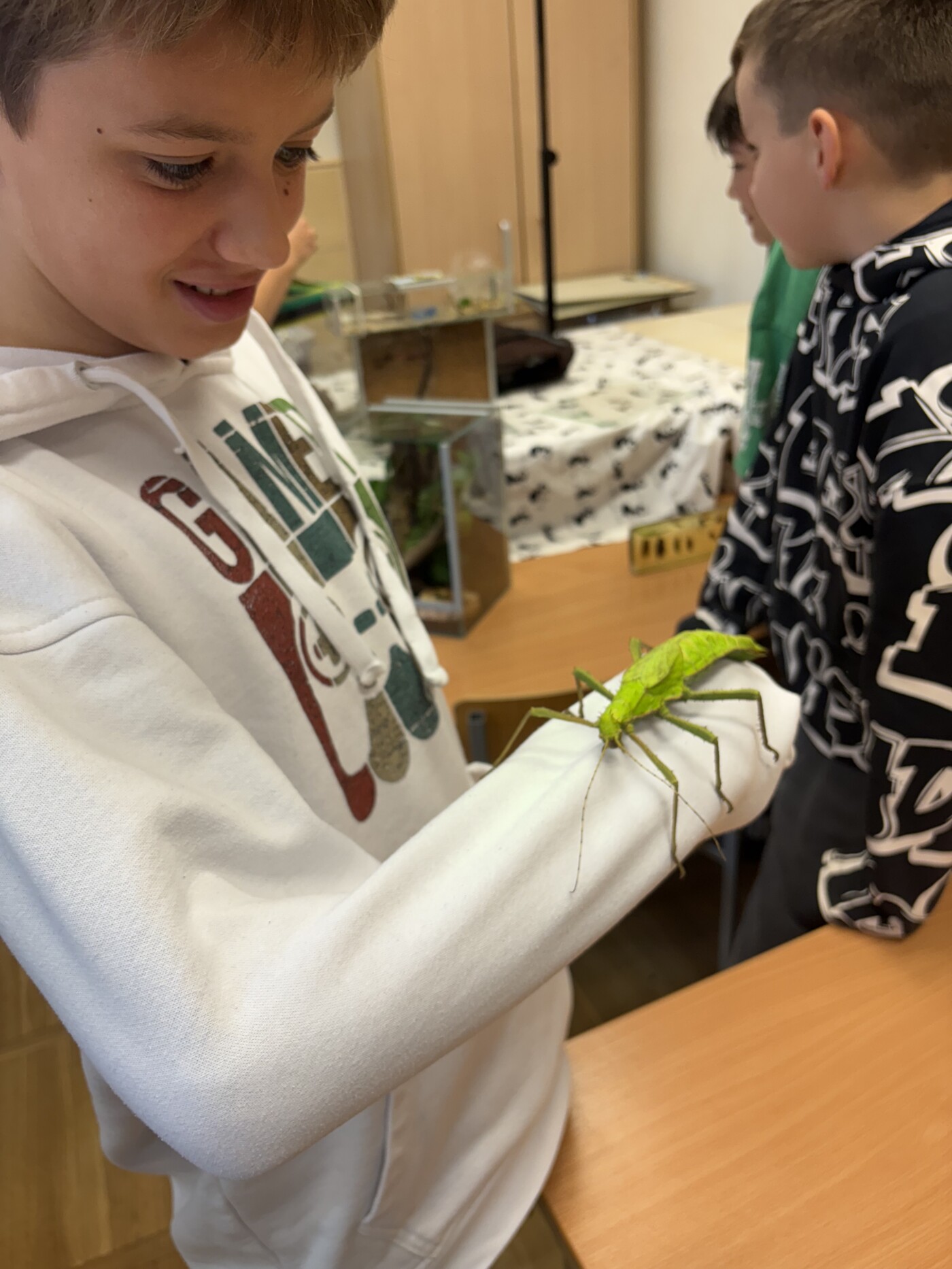 Następnie odbyła się część praktyczna warsztatów. Uczniowie mieli możliwość osobistego potrzymania modliszki, straszyka czy też karaczana, zajrzeli także do wnętrza formikarium gdzie zapoznali się z życiem codziennym i zwyczajami mrówek)