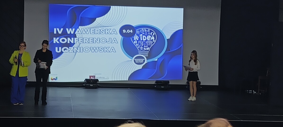 W dniu 9 kwietnia 2026 r. w Wawerskim Centrum Kultury (filia Międzylesie) odbyła się IV Wawerska Konferencja Uczniowska. Naszą szkołę reprezentowały dwie uczennice z klasy 6a. Hania Makowska i Ola Szymańska wystąpiły w sali widowiskowej i przed zgromadzoną publicznością przedstawiły swój autorski pomysł przebudowy ulicy prowadzącej do naszej szkoły. Uczennice przygotowały własny projekt graficzny i zgromadziły bardzo solidne argumenty. Przemówienie przygotowały we współpracy z nauczycielką języka polskiego.